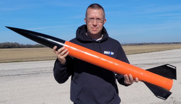 He builds his own custom designs including large, two-stage rockets with dual deploy.